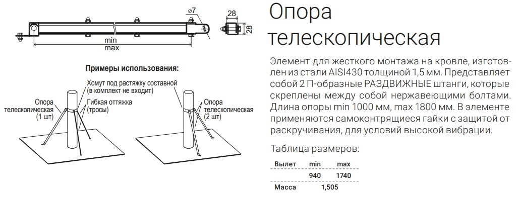 Элемент для жесткого монтажа на кровле, изготовлен из стали AISI430 толщиной 1,5 мм. Представляет собой 2 П-образные РАЗДВИЖНЫЕ штанги, которые скреплены между собой нержавеющими болтами. Длина опоры min 1000 мм, max 1800 мм. В элементе применяются самоконтрящиеся гайки с защитой от раскручивания, для условий высокой вибрации.