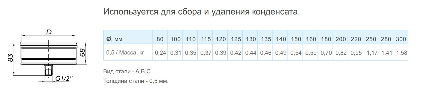 Страна.....................................Россия Производитель.....................FERRUM Материал................................Нержавеющая сталь AISI 430 Толщина стали......................0,5 мм Способ соединения.............Раструбный Тип сварочного шва............Встык